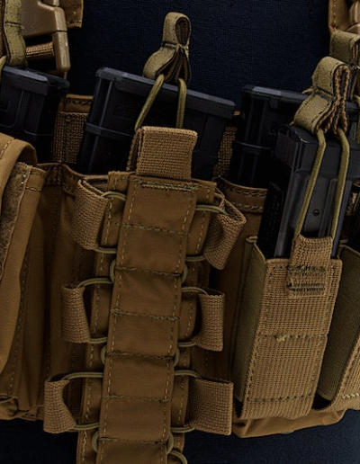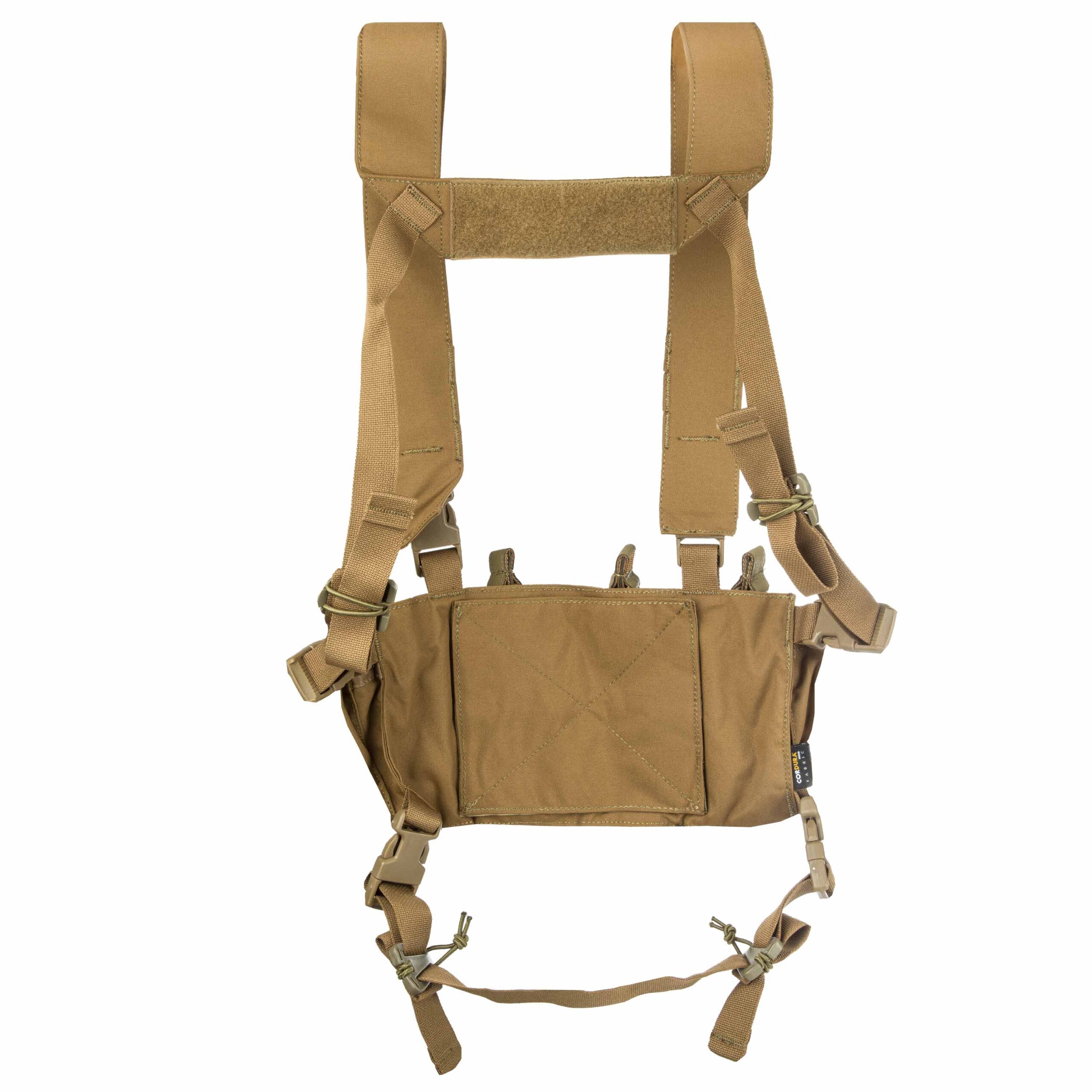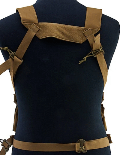 Está fabricado con nylon 500D duradero, que garantiza una buena resistencia a los daños mecánicos y, además, una resistencia parcial al agua. El chaleco está equipado con tirantes en configuración «H » – muy confortable, proporcionando al usuario comodidad y una correcta distribución del peso. Delante de los tirantes hay cintas cosidas, que pueden utilizarse, por ejemplo, para sujetar una radio o un tubo de camello