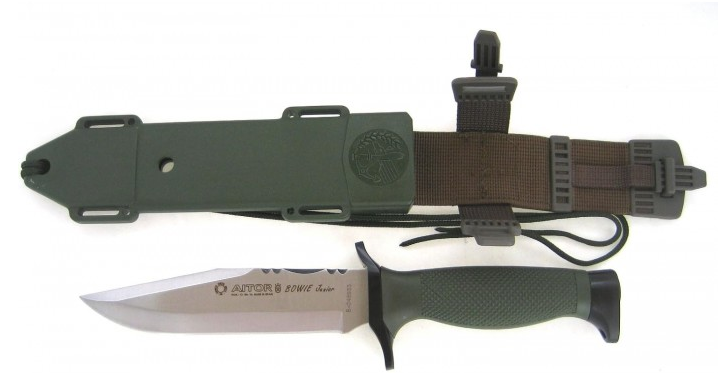 Cuchillo AITOR BOWIE Junior 16082 con hoja de acero mova y empuñadura de laton y poliamida verde. Incluye funda de Poliamida verde.